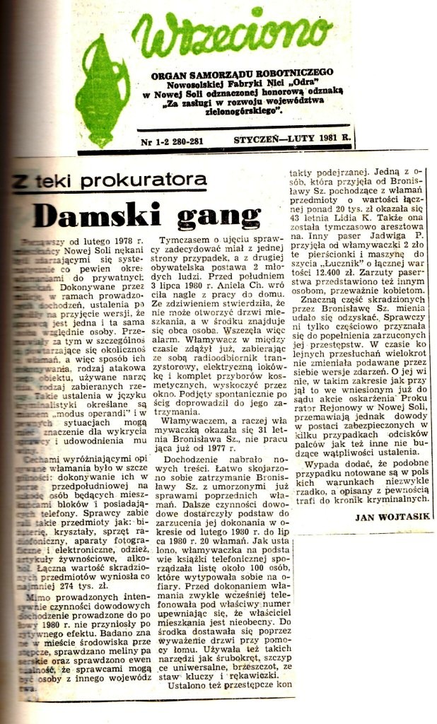 Zatrzymanie Bronisławy Sz. dało początek zaskakującym ustaleniom. Najstarsi milicjanci ani prokuratorzy nie pamiętali bowiem, żeby w kryminalnej przeszłości Nowej Soli pojawiła się kobieta – włamywacz z tak „imponującym dorobkiem”. Sprawnością działania fizycznego, ale przede wszystkim niezwykle przemyślnym planem i skutecznością Bronisława Sz. mogłaby zawstydzić niejednego nowosolskiego złodzieja.