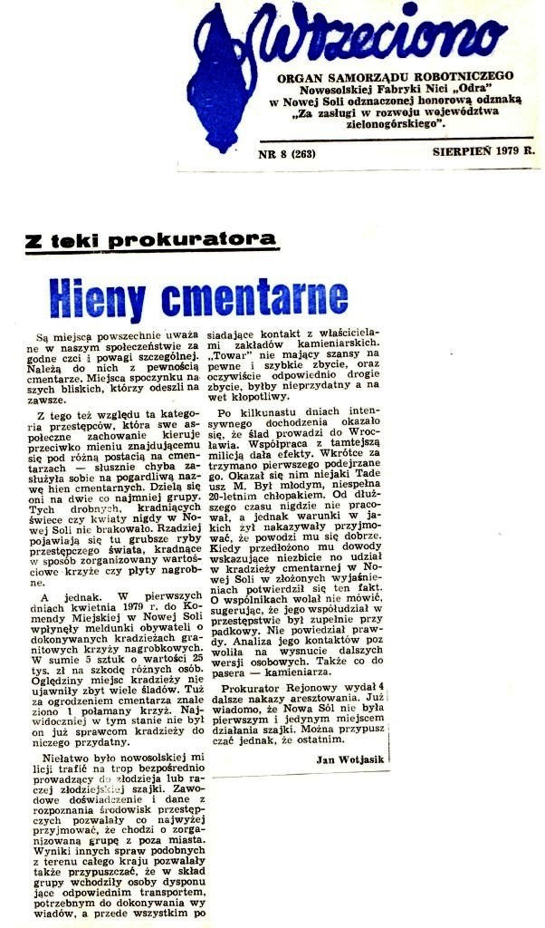 Publikacja traktuje o wyjątkowo niesympatycznym problemie, jakim jest okradanie nagrobków. Tym razem jednak nie chodziło o kwiaty czy inne elementy wystroju grobów. Stawka była znacznie poważniejsza. Wiosną 1979 r. w Nowej Soli i kilku okolicznych miejscowościach dokonano kradzieży kilkunastu krzyży i płyt nagrobnych.