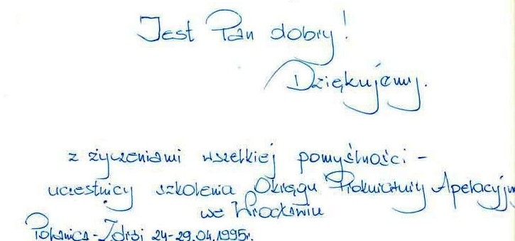 Jest Pan dobry! Dziękujemy. Czy prowadzącemu szkolenie może przytrafić się bardziej sympatyczna nagroda? W kwietniu 1995 r. w Polanicy Zdroju odbyło się szkolenie przygotowujące aplikantów Apelacji Wrocławskiej do egzaminu prokuratorskiego. Po skończeniu zajęć aplikanci wręczyli mi drobną pamiątkę z taką właśnie szczególną dedykacją.