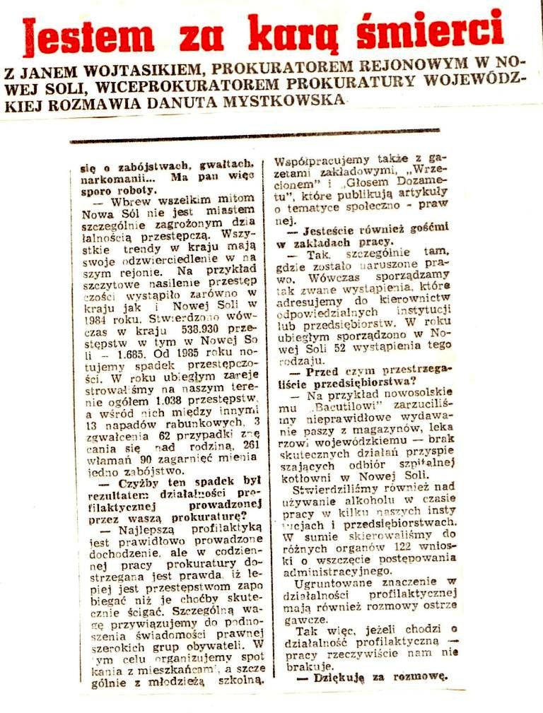 Wypowiedź jakiej udzieliłem Pani Redaktor Danucie Mystkowskiej z Gazety Lubuskiej w lutym 1988 r. dotyczyła wielu różnych problemów związanych z pracą prokuratora. Jednak redakcja kilkakrotnie i w tytule i podtytułach kilkakrotnie zaakcentowała wątek kary śmierci. W rezultacie takiego zabiegu zagadnienie „za” czy „przeciwko” karze śmierci uznano za najważniejsze przesłanie mojej wypowiedzi dla GL.