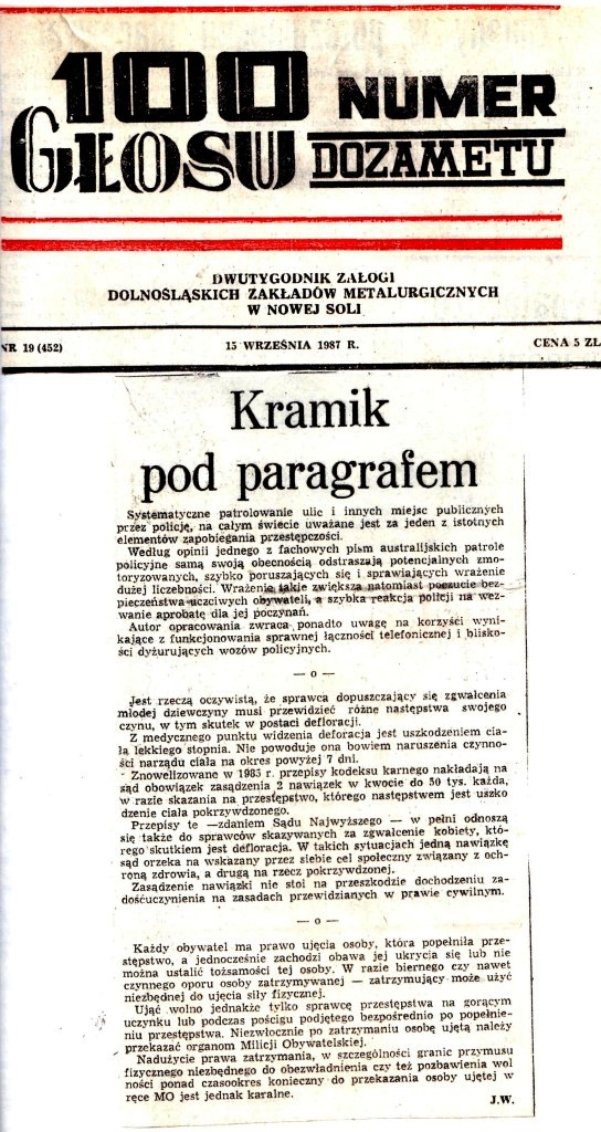 Publicystyka społeczno-prawna zorientowana na podnoszenie poziomu świadomości prawnej lokalnej społeczności uprawiana była przez nowosolską prasę zakładową także w II połowie lat 80.tych XX wieku. Do tego nurtu zaliczał się m.in. cykl „Kramik pod paragrafem” publikowany w Głosie Dozametu.