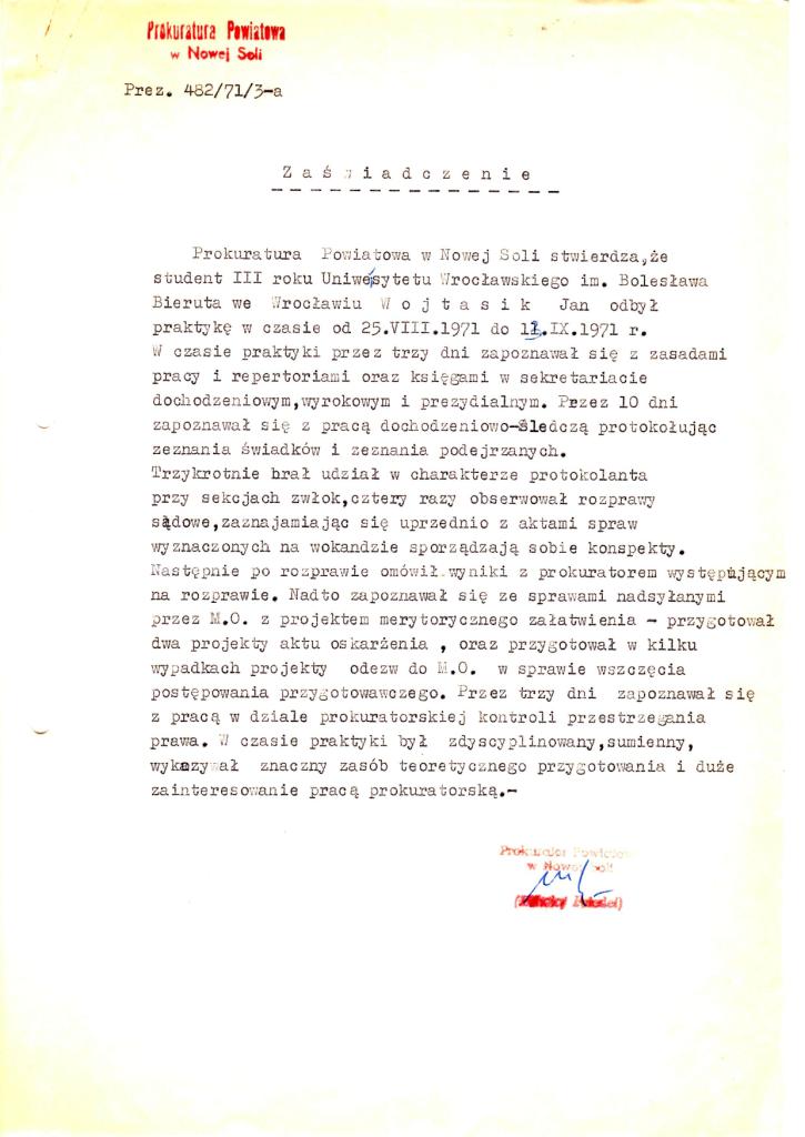 Zanim udziałem studentów stały się tzw. praktyki robotnicze, gdzie mieli zapoznać się z trudami życia i pracy prostych ludzi, uczelnie w porozumieniu z zakładami pracy organizowały studenckie praktyki zawodowe. Ja trafiłem na taką praktykę w sierpniu 1971 r. do Prokuratury Powiatowej w Nowej Soli.