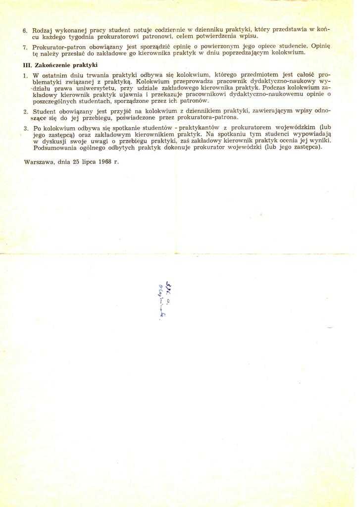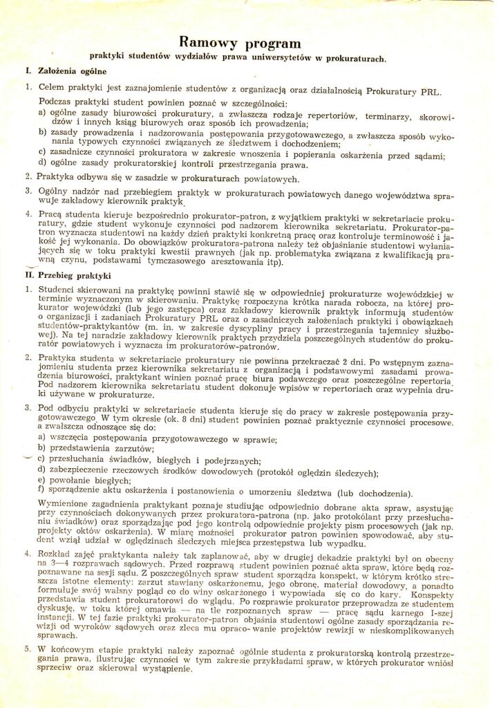 Praktyka odbywała się wg ściśle wyznaczonych reguł. Datowany na 25 lipca 1968 r. dokument o nazwie Ramowy program praktyki studentów wydziałów prawa uniwersytetów w prokuraturach najprawdopodobniej otrzymałem w dziekanacie jeszcze przed udaniem się na praktykę. Myślę, że warto go przypomnieć, gdyż wiele wiele spośród jego założeń mogłoby z powodzeniem sprawdzić się także obecnie.