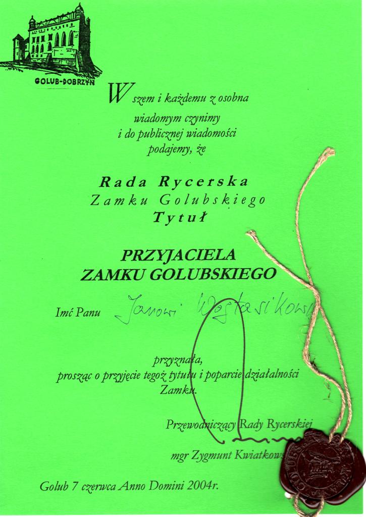 Golub-Dobrzyń zamkiem stoi. Rada Rycerska tego zamku w czerwcu 2004 r. postanowiła przyznać mi tytuł Przyjaciela Zamku Golubskiego.