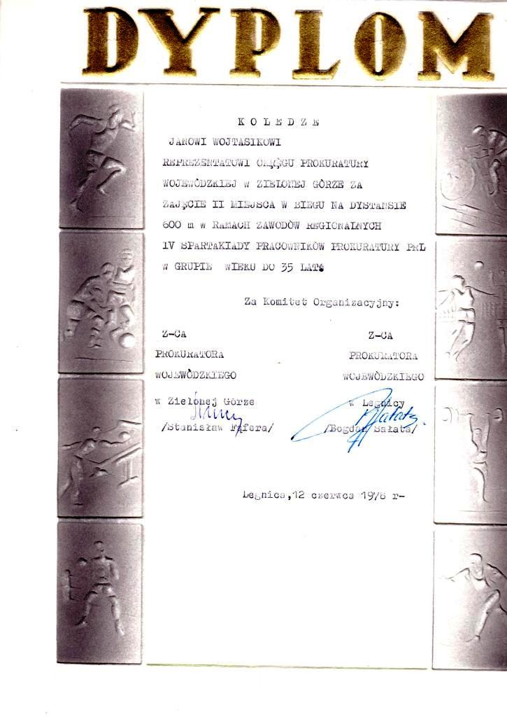 To były czasy. Zresztą średnie dystanse w biegach zawsze były moją mocną stroną. Wprawdzie zwycięzca jest tylko jeden, ale drugie miejsce w biegu na 600 m w ramach zawodów regionalnych IV Spartakiady Pracowników Prokuratury w grupie wiekowej do 35 lat bardzo mnie ucieszyło.