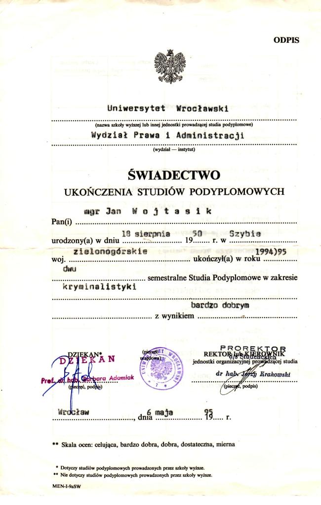 Jedną z najważniejszych i użytecznych form zdobywania specjalistycznej wiedzy z zakresu nauk sądowych były studia podyplomowe z kryminalistyki, jakie podjąłem w 1994 r. na Wydziale Prawa i Administracji mojego macierzystego Uniwersytetu Wrocławskiego.