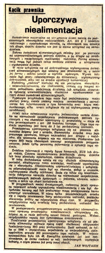 Publikacja o uchylaniu się od obowiązków alimentacyjnych z 1987 r. stanowi taki własnie przykład edukacji społeczno-prawnej. Pojawiła się w ramach popularnego cyklu „Kącik prawnika”.